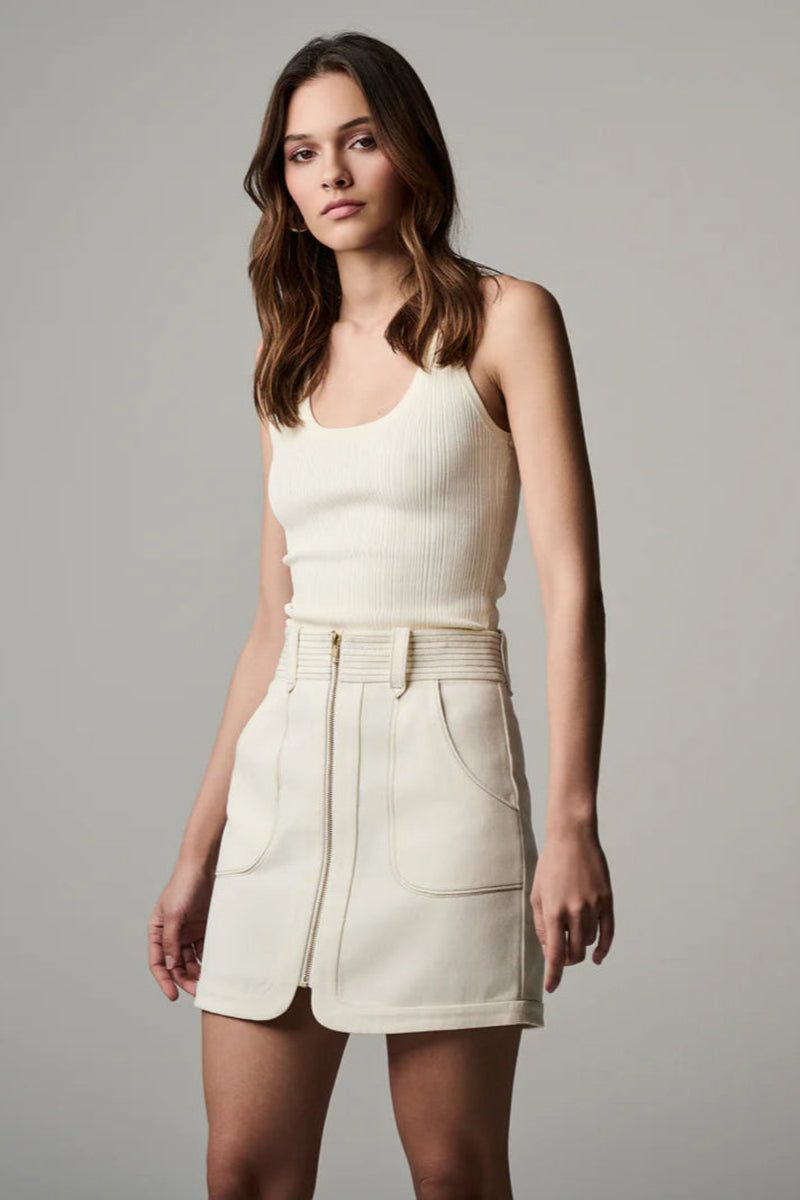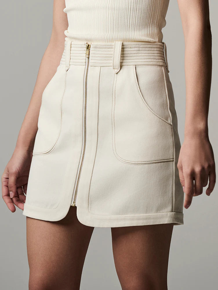 Crafted in Cotton Twill, the Nora Mini Skirt offers precise tailoring with a fitted waistline and functional belt loops. A gold, center front exposed zipper and exaggerated pockets accent the structured silhouette.
