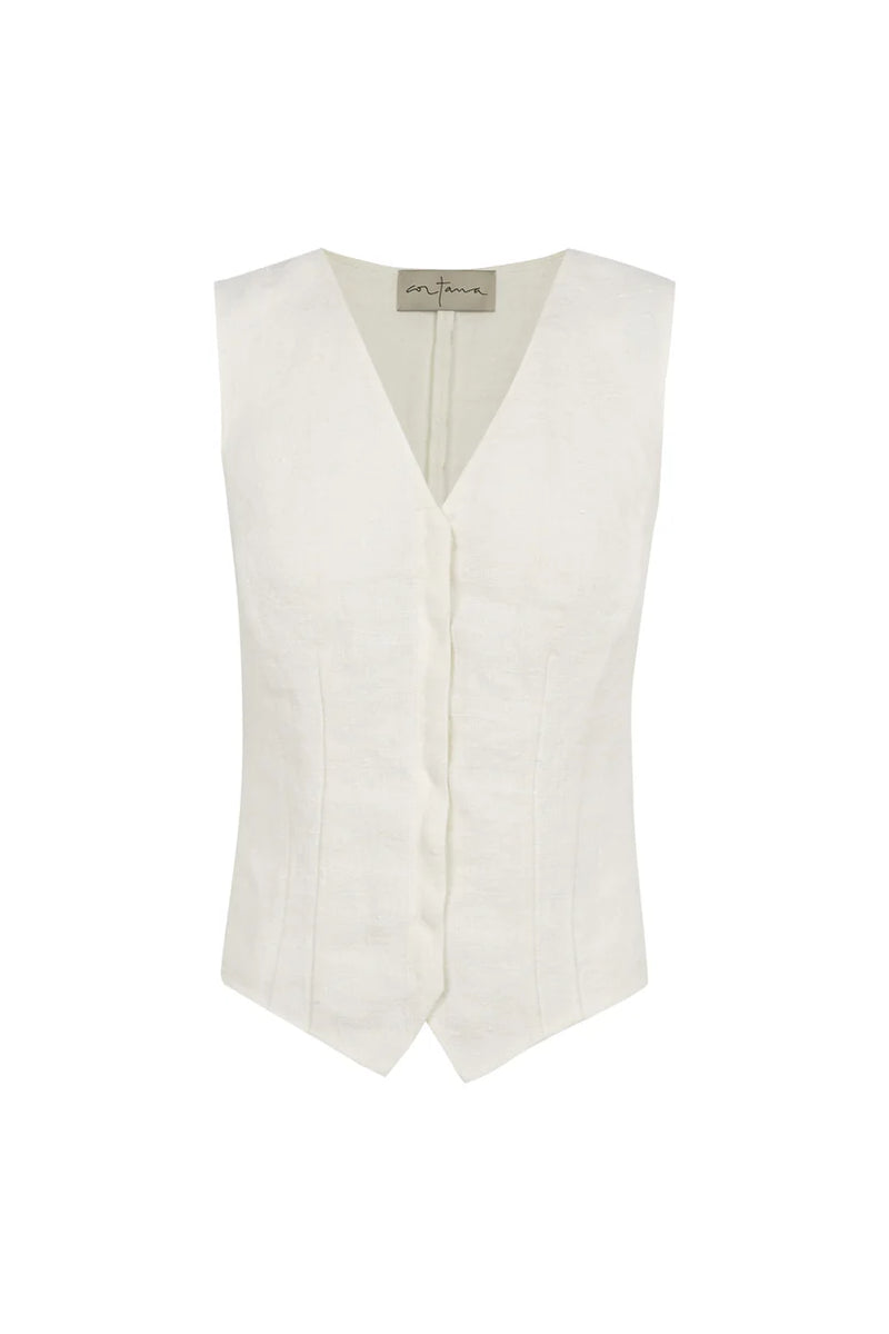 Fitted vest with a V-neck and invisible buttons made of linen. The linen fibres in Cortana collections are woven using traditional methods. This can create slight variations in the thickness of the yarn in different garments. These subtle differences contribute to the distinctive charm of our designs and these characteristics are an integral part of the artisanal quality of natural fibers and yarns.