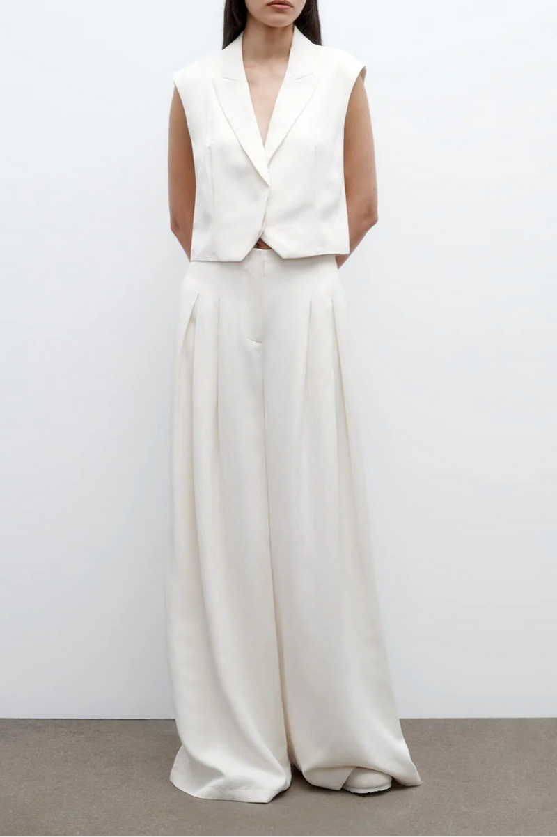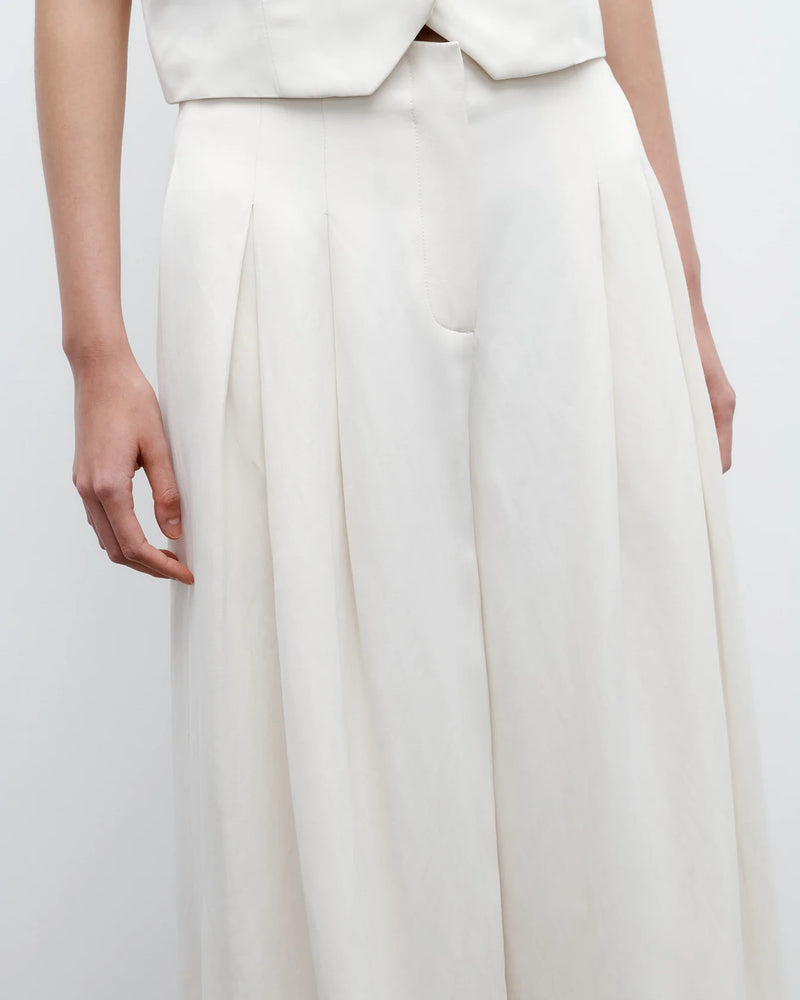 High-rise, wide leg pants in coated viscose linen. We combined a european flax linen, and viscose coating, creating a fabric with a deep color saturation, elegant drape and satiny sheen. The Drew has floor length pleats through the leg. Complete with side pockets, a concealed zip fly and hook and bar fastening at the waist.