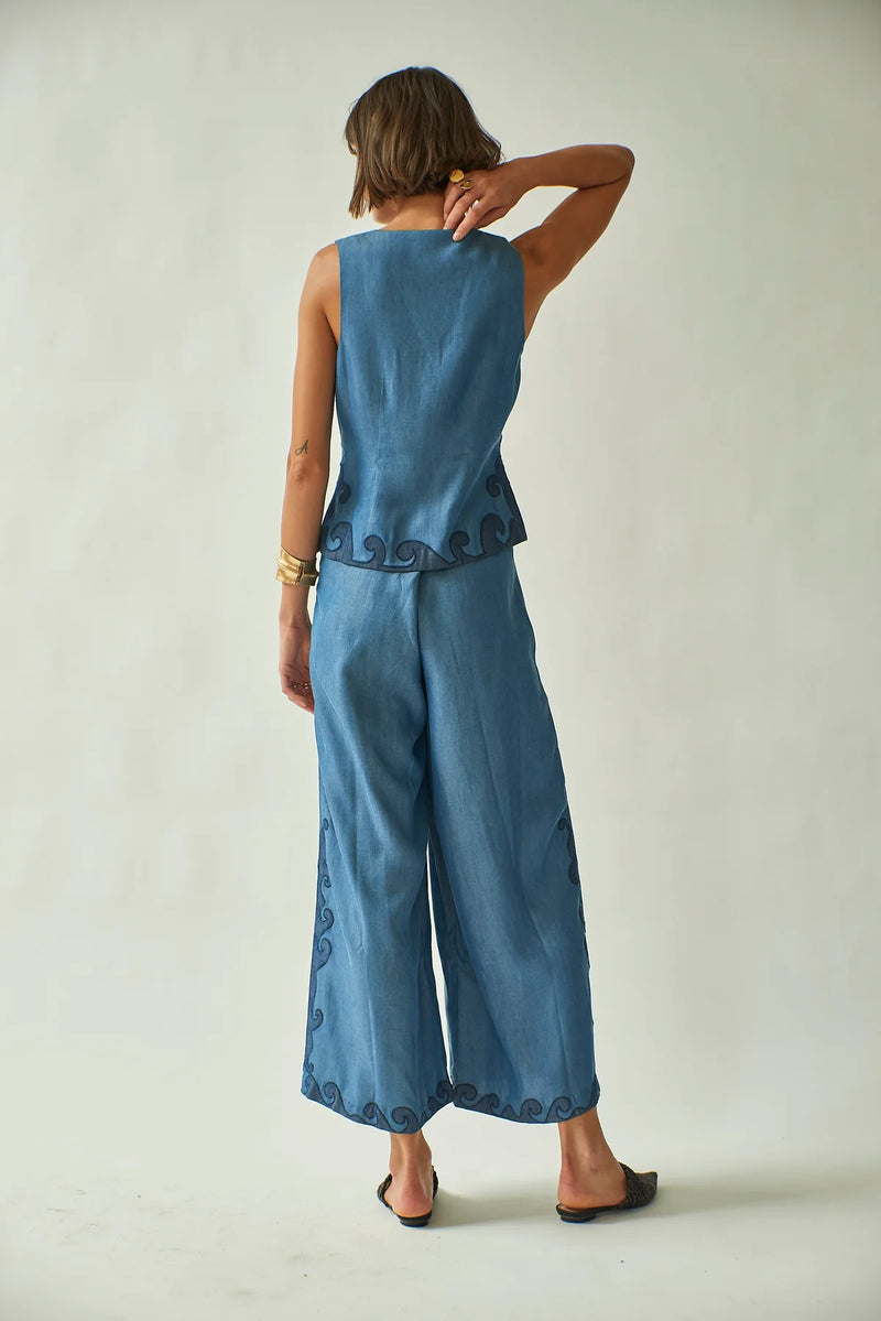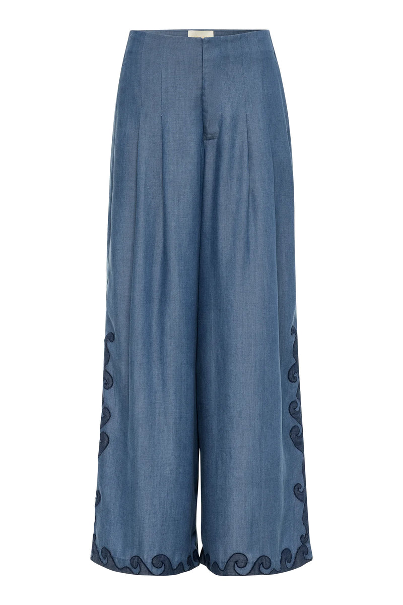 Tencel Denim, Wide-leg pants, Side slant pockets, Intricate dark blue embroidery along the edges, straight hem, Lined