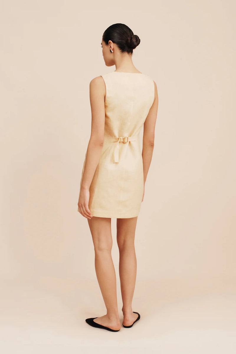 Cut from premium linen, the Emma Mini Dress features an elegant high neckline, mottled centre-front buttons and a curved hem. Use the adjustable back buckle to create a cinched silhouette.