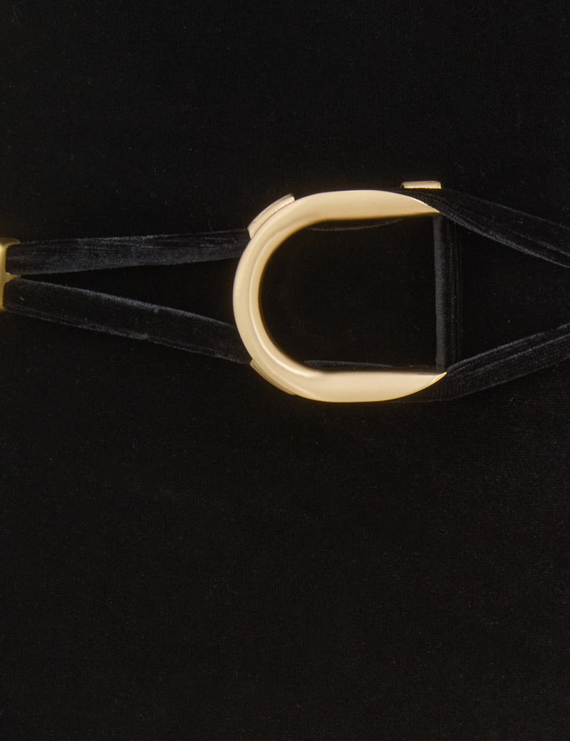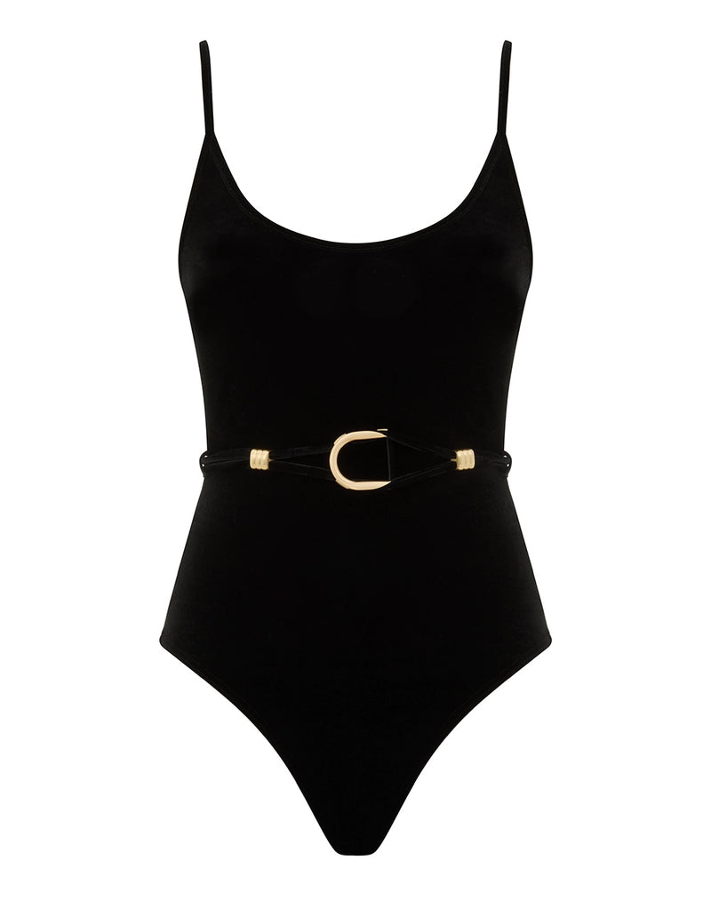 The Rhiannon Velvet Scoop 1PC in Black from our Summer Swim 2025 Collection. A lycra one piece featuring a velvet finish, scoop neckline, removable belt and an open back. Lycra one piece swimsuit with velvet finish, Scoop neckline with adjustable straps, Removable belt with gold buckle, exposed back below shoulder blade, Full coverage bottoms, Lined at front only.