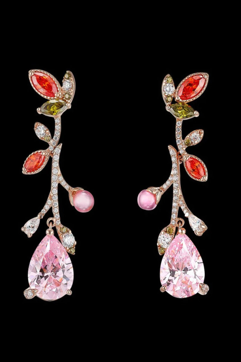A stunning, modern and colorful pair of cocktail earrings in 18k rose gold vermeil with 18k gold earring posts and butterfly backs, handset with a vivid array of laboratory-grown and created gemstones including two 12 carats pear-cut blush pink sapphire drops, olive tourmalines, orange sapphires and simulated white diamonds.