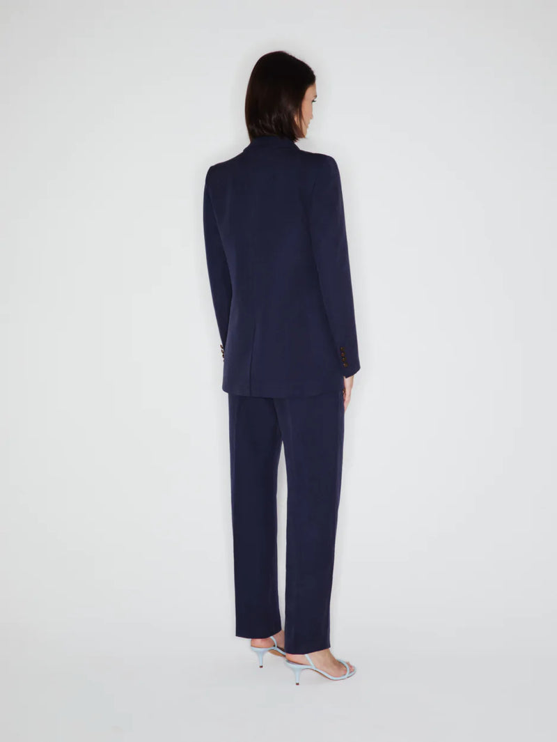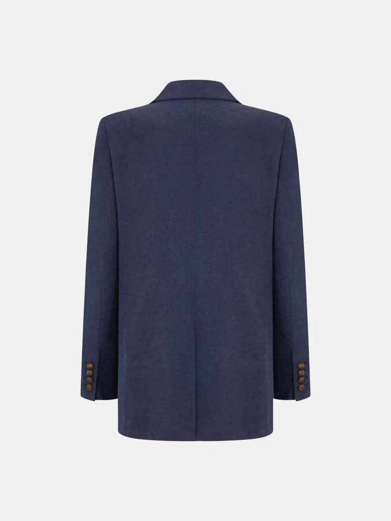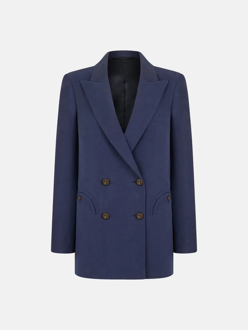 BLAZÉ Milano ultra-light silk-linen blend Savannah style is introduced in deep navy, tailored in the brand's classic straight-down Everyday cut. Detailed with glossy, braided design buttons, this Essentials piece can be summer suited with matching pants or a skirt. Double-breasted, Fits true to size with lightly padded shoulders, Tailored for a straight cut through the waist, Navy colored lining, Glossy loden inspired buttons, Peak lapels, Single back vent.